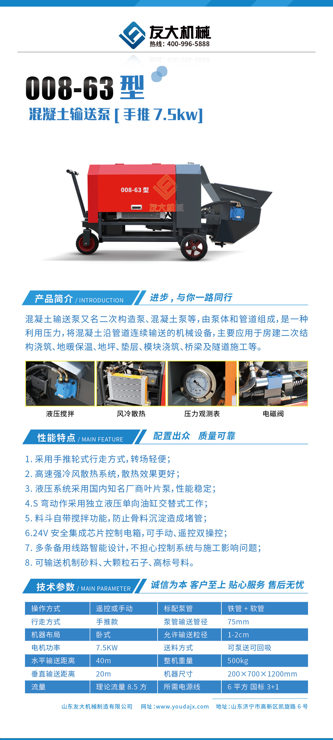 采用泵车尾轮驱动系统轻松解决移动时带来的各种困难,采用双排风冷散热系统散热效果更好,液压系统采用压力更高,性能更稳定的柱塞式自动变量主油泵,采用先进的三维立体压模一体式自动搅拌料斗可输送...