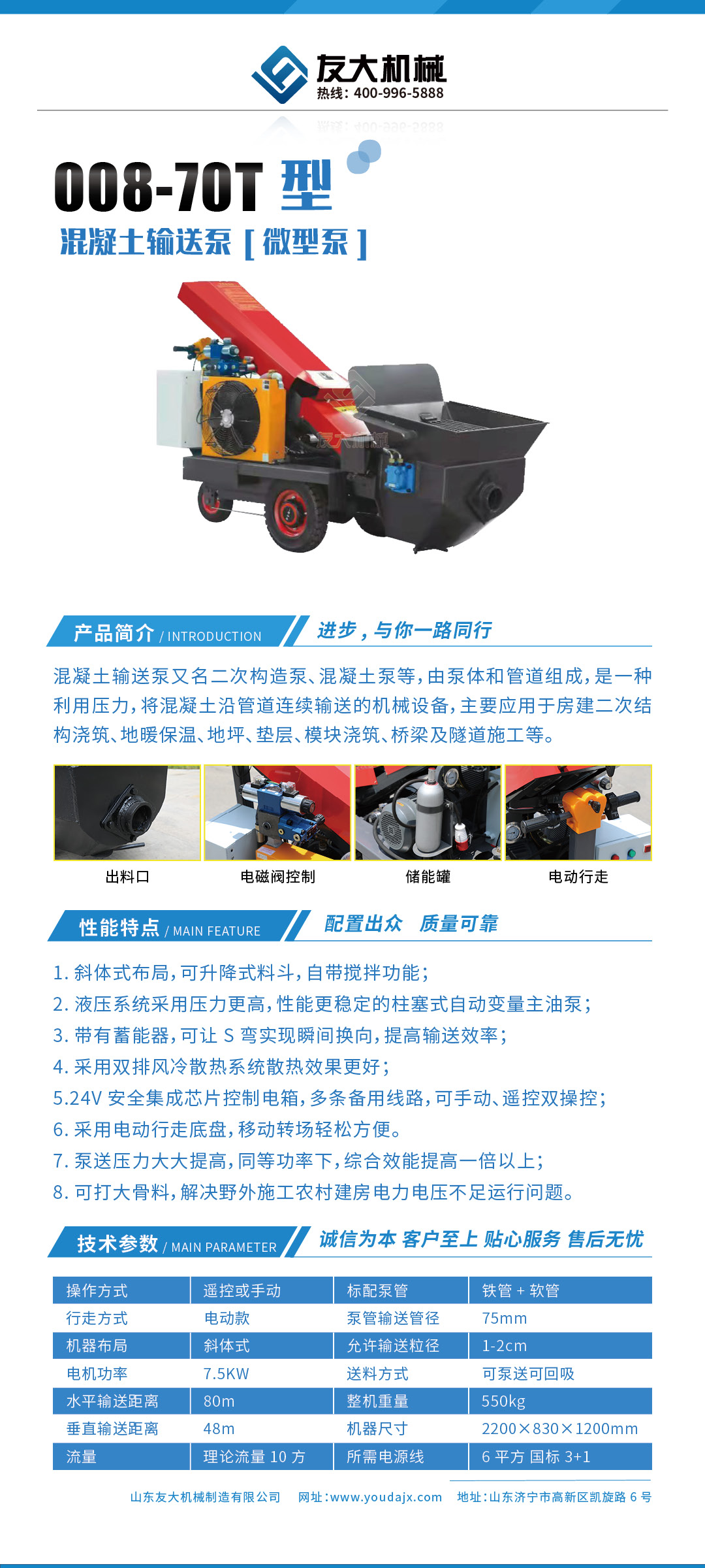 采用泵车尾轮驱动系统轻松解决移动时带来的各种困难,采用双排风冷散热系统散热效果更好,液压系统采用压力更高,性能更稳定的柱塞式自动变量主油泵,采用先进的三维立体压模一体式自动搅拌料斗可输送...